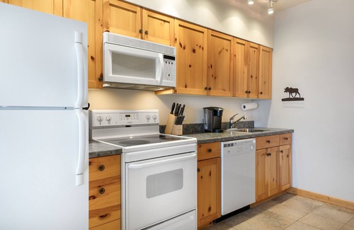 The full kitchen is equipped with a full-size fridge, a dishwasher and a stove, perfect for preparing simple meals or heating up leftovers. The rustic charm is evident in the cabinetry and countertops, which feature natural wood finishes that complement the overall Montana aesthetic. Basic cooking utensils, dishes, and glassware are provided, allowing you to enjoy home-cooked meals with ease.