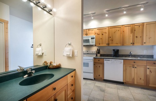 The full bathroom offers all the amenities you need to freshen up and unwind after a day of exploring the Montana wilderness. It features a tub/shower combo with modern fixtures, a vanity with a mirror, and ample storage for your toiletries.