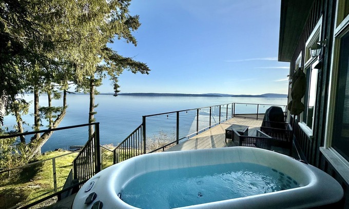 Walk on waterfront suite with panoramic ocean, island, and mountain views. The suite is a bright and open concept 750 sq ft upper unit, with 1 bedroom and 1 bathroom, plus a sofa bed. It features all new appliances, A/C, smart TV, and private hot tub and BBQ on the 300 sq ft deck. The house is located at the end of a private rd, and the property is fenced and gated. Make this your home base and explore the Cowichan Valley's beaches and lakes, hiking trails, biking trails, wineries, cideries and more.