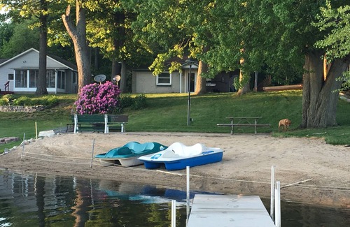 Newly remodeled Lakefront Cottage located on all sport Twin Lake, great fishing, swimming, water skiing, fire pit, outdoor grill, internet, Cable or Satellite TV, Laundry, air conditioning. Pontoon available for rent, Firewood available for sale onsite. Island on lake just 100 yards away (within viewing and shouting distance) for kids to explore, fish, catch turtles, and swim on beautiful sandy swimming area. Paddle boats provided. Usually a 4th of July fireworks show on Island in front of house. Rental spot available for Camper as well.