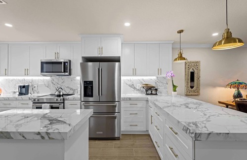Culinary enthusiasts will love the fully equipped kitchen, boasting top-tier appliances and expansive modern countertops with a central kitchen island, all designed to make your cooking creativity shine. Then gather around the kitchen bar to share mouthwatering meals with your family and friends.