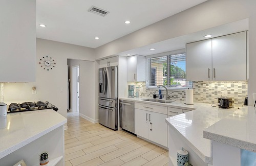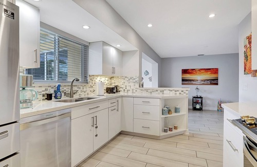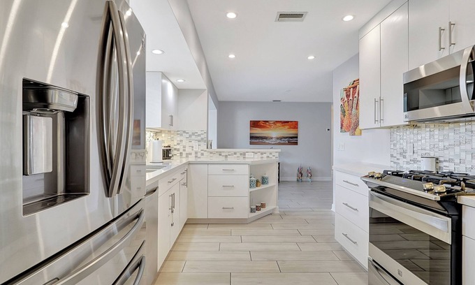 The home’s bright and airy interior offers an open floorplan curated with contemporary furnishings and sophisticated décor to maximize connectivity and relaxation. Sink into plush sofa seating in the living room while you stream all your favorite entertainment on the mounted smart TV. The stylish kitchen showcases stainless steel appliances, glossy stone countertops, and sleek white cabinetry stocked with cookware and dining ware for all your culinary endeavors. Gather around the chic dining table for formal meals or snag a stool at the counter to assist in meal preparation or nosh on a spread of delicious hors d’oeuvres.
