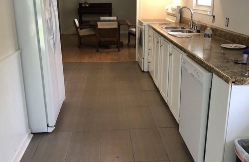 This mobile home, turned permanent home over time, has all new appliances, washer dryer, tile floors in kitchen and bathrooms, laminate floors throughout, a new central AC unit and a spacious back covered porch. There is a porcelain bathtub for the kids in one bathroom and a stand up shower in the master bath. one king bed, one queen bed and two twin beds are all comfortable with great sheets and pillows. With a card table as the indoor dining table you can play spades and Yahtzee for hours in comfort. A leather couch and chair comfortably seats 4. There is basic Direct TV. The kitchen is stocked with pots, pans, utensils, plates/cups, Mr. Coffee coffee pot, and a microwave. There is one blow dryer.