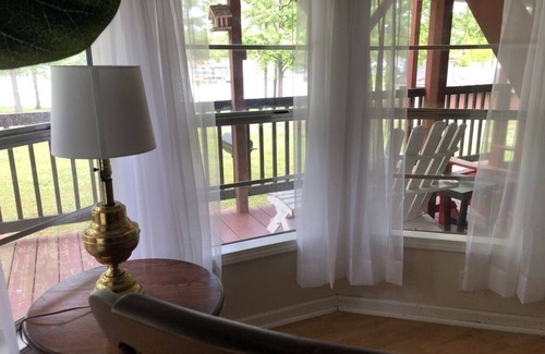 Outside - The level shady lot is suitable for all ages. We have outdoor dining on the covered back porch and picnic table at water, a park style charcoal BBQ grill, excellent boat ramp, horse-shoes, lots of shade trees, and a fire pit, situated on a lot just under an acre. Enjoy swimming between the sea wall and the dock as there is a good bottom and swim ladders to get up on the dock. From April to December the water is approximately 12' deep at the end of the dock and 3' deep at the sea wall. Launch your boat from the ramp on property and leave it moored under the covered dock for easy access during your stay. The kids and grandpa can easily fish from the sea wall when you aren't on your boat. The water on this cove is a great depth for enjoying tubing with the kids. The fire pit is near the water and there are many outdoor chairs you can use. Located at the end of a culdesac, this hometown neighborhood is safe and relaxing. The neighbor's gentle small dog will likely swing by and visit, especially when you're cooking hamburgers!