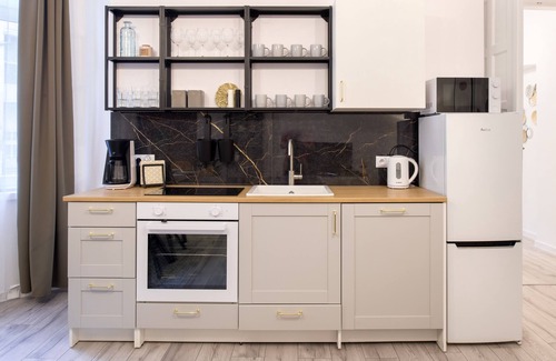 Fully equipped kitchen: fridge, gas stove, oven, microwave, kettle, drip coffee machine. Guests can use glasses, plates, pots and pans, as well as coffee, tea, sugar and spices.