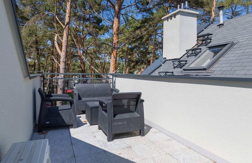 The apartment is located on the 2nd floor and can accommodate up to 7 people – it’s a perfect choice for group vacations with family or friends. The spacious 64 m² surface of the apartment is divided into two levels. On the 1st level, there is a living room with a double sofa bed and kitchenette, a bedroom with a double bed, and a bathroom with the shower. The living room also has access to a cozy balcony with garden furniture. The 2nd level features an attic bedroom with 3 single beds, a second bathroom with a shower, and a big terrace. The terrace, fitted with a coffee table and comfortable armchairs, can be a great spot for spending time in warm summer evening while enjoying the green forest view. The interior of the apartment combines elegant, modern décor with high standard amenities. The air conditioning in the living room and the upper-level bedroom provides optimal temperature in every weather and season. Multimedia include a flat-screen SmartTV and free access to a Wi-Fi network. Additionally, full kitchen and bathroom facilities, such as a washing machine or a dishwasher, increase the self-dependence of our guests. Parents traveling with a child can also order a cot and a high chair for their child. Guests travelling by car can park of a private outdoor parking spot on the premises of the estate.