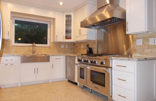 Newly remodeled kitchen with stainless steel appliances, 3 ovens, 6 burner gas stove, commercial ice maker and granite counter tops.