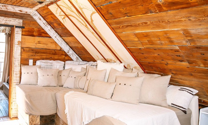 A modern, rustic loft on the second floor of this charming historic home. Plan the perfect getaway in these 2 bedrooms that will sleep up to 5 people comfortably. Main bedroom features a king-sized bed with a private balcony, second bedroom features two double beds. The split floor plan offers an open living room/kitchenette area with seating, an apartment-sized refrigerator, Keurig coffee maker, and microwave.