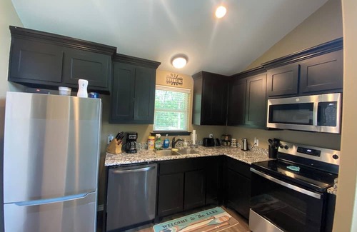 Knot Shore Lakehouse offers a fully stocked kitchen—just bring your food! We provide complimentary coffee and filters for the coffee maker. Outdoor living includes a gas grill, patio furniture, a place for boat parking, and bistro-style lighting. The master bedroom is furnished with a queen bed and features an ensuite bath and a walk-in closet. The guest bedroom has two twin beds, is adjacent to the second bathroom, and also has a walk-in closet. The dining room seats six, and the kitchen is fully equipped. There are TVs in the living room and bedroom; bring your own Roku, Firestick, gaming devices, etc as plug-ins are available. You also have access to a washer and dryer, located in the foyer closet, with laundry detergent provided.