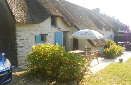 location - in an era chaumiere - with a double bed, a room with 2 single beds, bathroom with shower, kitchen-living room, equipped kitchen, fridge, microwave, TV, sofa bed settee in the living room, terrace garden