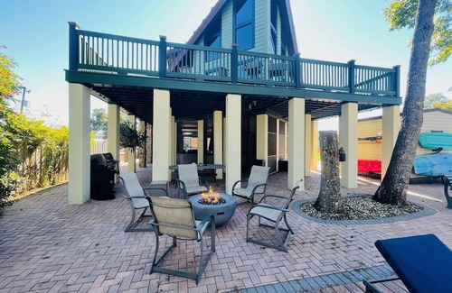Impressive tri-level 3 bedroom log home on the Weeki Wachee River - five miles downstream from Weeki Wachee Springs State Park. This 1700 sq. ft. home has a sleeping capacity for 10 people. Amenities include kayaks (5 singles, 1 junior, kayaks may vary. Rentals available nearby), a spacious ground level screened entertainment room featuring a mini-kitchen, half bath, large TV with ample seating, river-front dock with lounge furniture, fenced grounds, Wi-Fi, five smart TVs, 2nd story deck off the living area, lower waterfront paver patio with BBQ grill and an outdoor shower, cold A/C, child gates, and on-site parking.