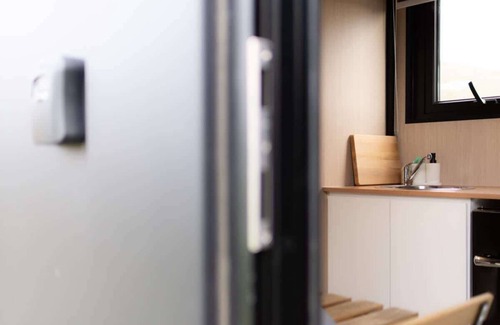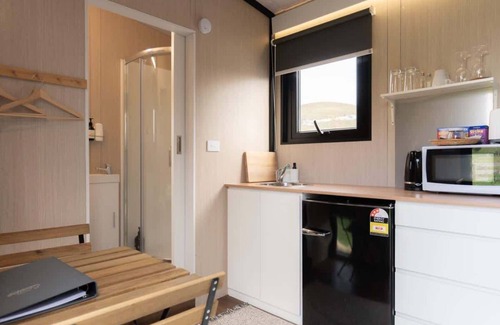 A cozy 139-square-foot tiny home is just an hour's drive away from Christchurch, with easy access to water, split air conditioning, a kitchenette, cooking equipment, and excellent bathroom facilities. The bathroom includes an eco-friendly cassette toilet with a removable waste holding tank, a hand basin, and a gas-heated shower for your use.