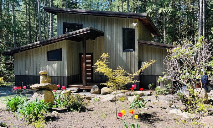 Wake up to birdsong and sunlight streaming through towering evergreens. Enjoy your morning coffee on the covered porch or unwind beside the stone garden surrounded by vibrant flowers and native plants. Inside, you’ll find a cozy, stylish interior perfect for couples, families, or solo adventurers.