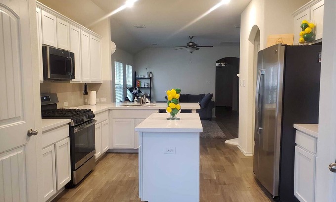 It feels just like home. Beautiful nice neighborhood. Close to major highways and restaurants and shops.
