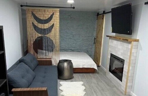 Studio apartment, well lit, modern design with futon and Queen Murphy Bed. All furnishings and appliances are new. This is a cozy spot for year round enjoyment