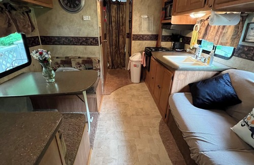 At the Glamper, you can enjoy the attached deck and porch swing with a private view into the woods. Inside, there is a Roku 4 for streaming, a dvd player, and entertainment center for the living room and bedroom that is capable of playing music inside and/or outside. There is also a full kitchen, dining area, and bathroom with a shower/tub. The back bedroom has 4 bunk beds and a flat screen tv with a Roku 4 as well as a Nintendo 64 with games for all you retro gamers!