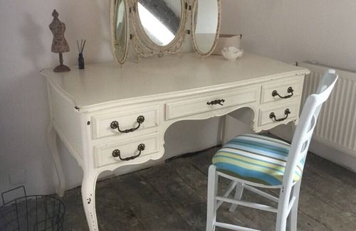 Back in the hallway, the stairs go up to the attic, which holds a large family room. This room holds a double bed and two single beds, a sofa and hanging rail. It also has its own spacious bathroom with shower, toilet and sink, cube cupboard storage system and dressing table/chair. There also 4 white bath robes for your use.