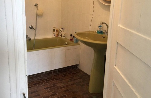 In the hallway there is also a small bathroom containing a bath and sink. There is also a separate toilet. From the hallway, you take wooden stairs up to the first floor.
