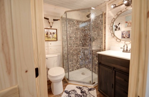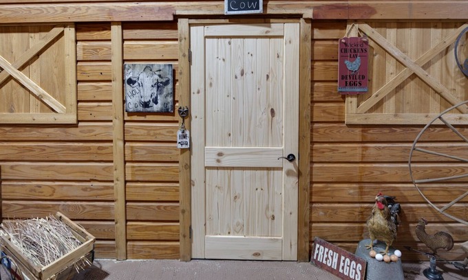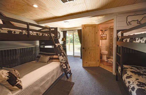 Holy Cow is a one of a kind room here at Solid Rock Ranch. The only room with an outdoor patio. There are two bunk beds for multiple sleeping as well as it's own bathroom. You will have access to the kitchen with a complimentary dry breakfast bar. You can also visit with the goats and horses on the property. There is also a zip line across the big lake as well as fishing!