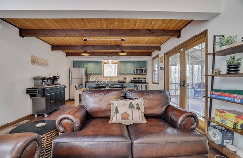 The fully equipped kitchen includes everything you need to dine in. Cozy up and relax near the warmth of the fireplace in the living room. The house has a small front deck and a large, oversized screened in porch and a firepit completes the experience!