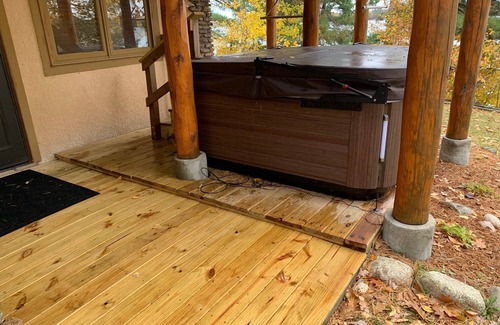 Total package! Up north feel with all of the amenities of home. Hot tub, sauna, plenty of space and 4 private bedrooms, laundry, Wi-Fi and internet, large screen TV's, two gas fireplaces, outdoor fire pit for smores, grill for BBQ's a massive elevated deck with awesome views of the lake, the dock is ready for fishing and swimming.. After a busy day on the water, or visiting the local sights, you can come back home to a nice campfire, soak in the hot tub, or do a little late night swimming.