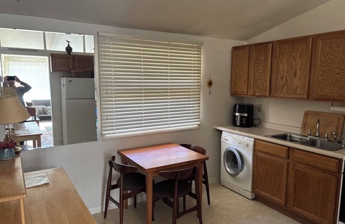 Kitchen with refrigerator, Keurig and automatic drip coffee maker, electric range and oven, microwave and air-fryer. Bathroom has bathtub with removable shower head and is equipped with safety grab bars. NOTE: The central air conditioner unit and water heater are within close proximity to other rooms, so when the unit turns on there is an abrupt “pop” sound. This is normal. Patio in backyard with chaise lounge, patio table with chairs, raised garden bed and large oak tree producing acorns which, which may fall on the roof over the master bedroom. One stall car attached garage and easement next to driveway for additional parking.
