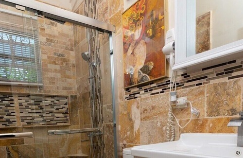 Our super clean and modern bathroom with walk-in shower and glass enclosure. Wall mounted hair dryer, and makeup mirror.