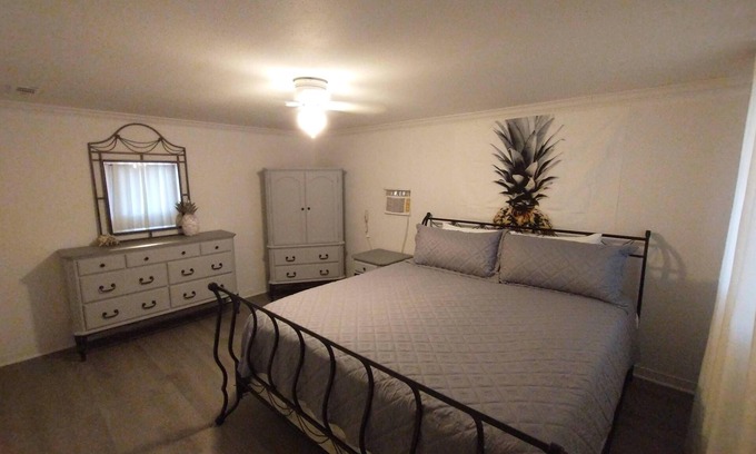 Welcome to The Pineapple House! Only 5 minutes to downtown Pensacola and 15-20 minutes to the beach. Gentrification is occurring and you will see a mix of homes (new construction to updated to those not yet revitalized), but it is generally quiet and very safe. Contactless check-in/out via electronic front door lock. Garbage/recycle cans on location. Free WiFi. Older construction, but clean home! Park on driveway. No smoking/vaping! Pineapple House is over 60 years old and, though greatly cared for, shows its age in some places. Expect to find some loving wear, quaint aging and charming patina both inside and outside. It is a block-built home, which was once the rage in Florida as they can generally withstand up to 250mph wind, though they don't tend to have the same aesthetic appeal as a traditional stick built home, therefore requiring a little more creativity with colors. :) The home boasts three bedrooms and one full bath. Two bedrooms have king beds and one has a full bed. One of the king beds is lower to the floor to make access easy and it is more firm, while the other king is taller and has an additional mattress pad making it very cushioned (some have said like sleeping on a cloud). The home has central heat and air conditioning, though the largest bedroom also has an additional wall AC unit to make it extra cold and stand-alone space heater for additional heat as it was an add-on room to the home. The living room and king bedrooms have TVs, though you will need to use your own login credentials for access to Prime, Netflix, Hulu, etc. We do have the Tubi app installed and The Roku Channel, which have news stations and movies available with no logon needed. No cable is provided. There is a washer and dryer in the home for your use, though you will need to supply your own detergent. There is a toaster and single serve Keurig coffee maker in the kitchen, as well as all of the typical pots/pans needed to make a home meal. Bath/beach/hand towels and washcloths are provided. The dining table can seat 4 and is located in the kitchen. The back patio is covered and has solar lights that automatically come on at dusk and stay lit for a reasonable amount of time typical for most people to sit out and enjoy. There are a few chairs and a small table on the back patio. 5 minutes to downtown Pensacola and 15-20 minutes (depending on traffic) to Pensacola Beach. We strive to keep costs down for our guests and don't charge fees for typical cleaning, though we do still pay our housekeeping staff and request that our guests try to leave the home as tidy as possible at check-out in order to maintain our lower nightly rates. We hope you enjoy your stay. *Please note, for privacy reasons and in accordance with their policy, VRBO doesn't release the exact address of the property until 30 days before check-in; if your check-in is less than 30 days from booking, the address is released shortly after booking.