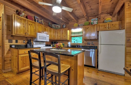 Inside, the cabin exudes warmth and coziness, with a gas-burning fireplace adorned with stack stone serving as the focal point of the inviting living space. Curl up on the plush furnishings and catch up on your favorite movies or enjoy a blissful nap in the comfort of your home away from home. The fully equipped kitchen boasts granite countertops and modern appliances, perfect for preparing delicious meals using fresh ingredients sourced from the river just steps away.