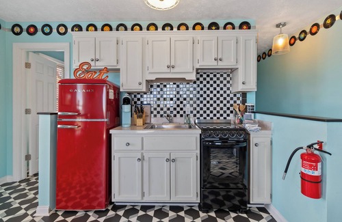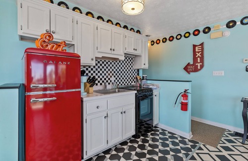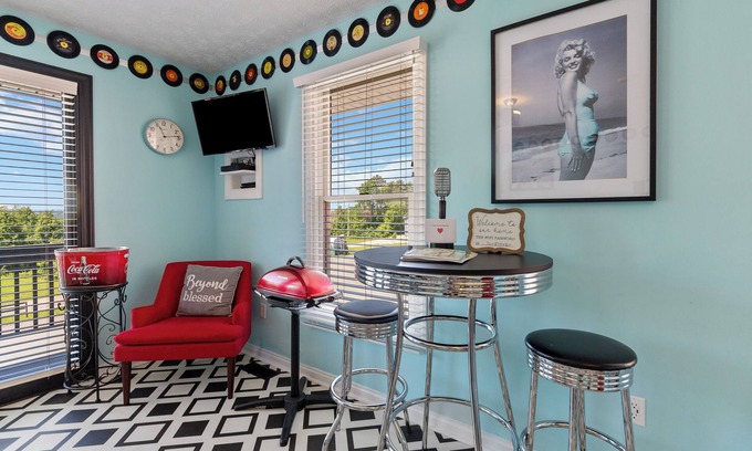 Embark on a journey to the “good ol’ days” with our Retro Suite, a whimsical 1950s-inspired haven where bold, playful colors bring back the charm of a bygone era. From the moment you arrive, you’ll feel the nostalgia with encounters of iconic American figures and a vintage record player spinning tunes from Elvis Presley and The Beatles. Perched above the Lake Cumberland Resort III office, this studio offers a unique escape with a discreet rear entrance, ensuring a private and tranquil retreat.