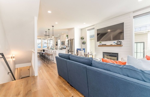 Shore Beats Work has 3 levels and sleeps 13 people comfortably with 4 bedrooms and 3 bathrooms. The upper-floor master bedroom has a king bed, a huge master closet, an en-suite bathroom and a built-in fireplace with a 60” smart TV and shiplap surround with stunning views of the lake. The bunk room features 4 XL twin bunks plus an XL twin pullout trundle bed. Each bed is equipped with its own lighting and lake views enclosed with a barn door--the kids love this room! The guest bedroom has a king bed, a 60” smart TV, and a shared bathroom in the hallway.