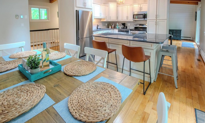 Inside, the cottage is equally inviting. Stretch out in the large great room on ultra-comfy sofas and enjoy your favorite shows on the large screen TV. Preparing meals is a pleasure in the well-equipped kitchen and separate dining room—though you might find yourself grilling more often than not out on the deck, just steps away from where you’ll dine. There is one queen size bed in the basement bedroom and a daybed that pulls out to a king size in the main basement. Upstairs, there is one queen bed and two double beds.