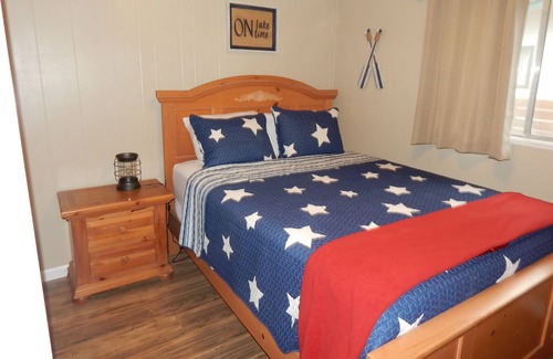 We have 2 well appointed bedrooms (1 queen, 2 twins) and one full bathroom with shower. The living room has a loveseat, large chair and a futon for additional sleeping space, and a desk. The backyard has a covered deck with a small view of the lake and a table with umbrella, and is fully fenced for your furry friends (Add'l $40/night for pets). Relax on our front porch with a cup of coffee or play a game of corn hole or horseshoes in our shaded backyard. If you are a member of the Ski Lodge or a guest of a member, we are 50 yards from there, an easy walk. We offer free WiFi, and a BBQ grill with everything you need for grilling and a full kitchen to prepare your meals inside.