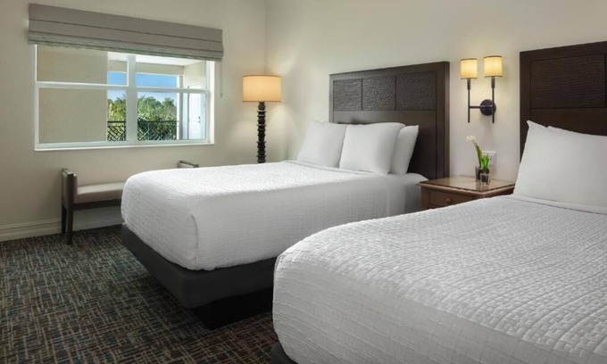 Coconut Cove at Bonita Springs is a Hyatt Residence timeshare property featuring a master suite with king size bed and deluxe bath with walk-in shower and soaking tub, and guest suite with two double beds and full bath. Luxurious amenities include full kitchen, dining area, screened-in lanai and seating area with TV, stereo, Blu-ray player and high-speed wireless Internet access. Price shown is for a two-bedroom unit. One-bedroom units are $75/night less.