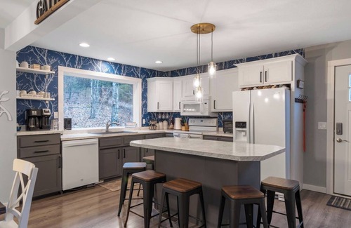 Escape to this beautifully renovated home, tucked away in a serene wooded setting yet just minutes from Branson’s top attractions with easy highway access. The spacious front porch and large deck with fire pit provide the perfect spot for outdoor relaxation. Enjoy the paved area with a basketball hoop, yard games, and a kiddie pool for family fun.