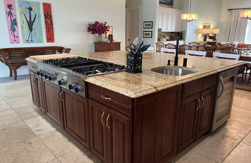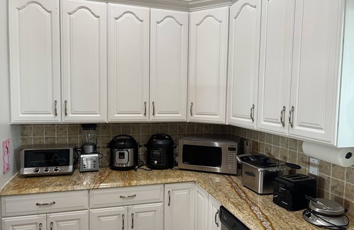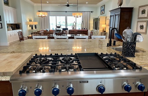 Our friends comment that the living area is the size of a basketball court. The huge kitchen island boasts double ovens, a six burner thermador gas stove, large refrigerator and every small appliance conceivable. It contains both casual dishes and china. It has everything a chef needs.