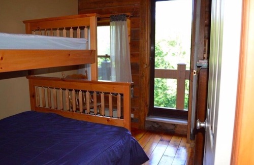 The house is four bedrooms, two and a half baths, and sleeps up to 9 people. The oversized Master Bedroom looking through the trees has a three piece ensuite, a large closet and a King sized bed. The three other bedrooms on the third floor comfortably sleep seven more people (room one with a double bed, room two with a single over double bunk bed, and room three with a queen, there is a cot available for an eighth person). The main level two piece bathroom serves as extra "comfort" when the upstairs four piece bathroom is in use.