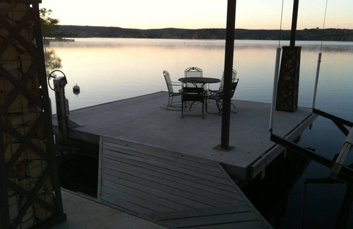 Wide concrete steps provide easy access to the water and boat dock on a private, no-wake cove ideal for swimming, fishing, canoeing, kayaking or floating peacefully on inner tubes with friends. The dock features plenty of space for sunbathing during the day or star gazing at night. With only one public boat ramp on the lake, boat or jet ski traffic is normally minimal.