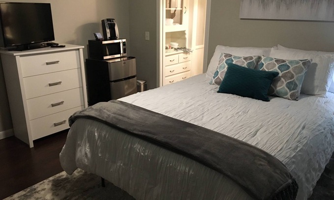 Welcome To The State Room! This clean, quiet, recently updated private en-suite room is just where you want to spend your vacation, with all amenities at your fingertips! You will have your own private entrance with a coded lock & free on-street parking. There is a mini-fridge/freezer, microwave and Keurig machine right in your suite for your convenience. This location is just (3) blocks to downtown & (4) blocks to the water/Independence Park.