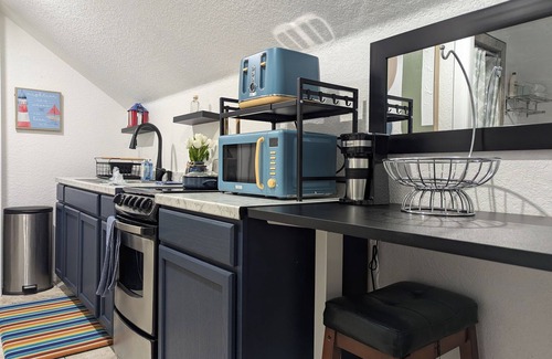 Ascend your very own private staircase to discover a delightful two-bedroom, one-bath suite. The moment you step through the door, you'll be greeted by a whimsical ambiance that exudes character and coziness. It's like staying in a treehouse, but with all the amenities you could dream of!
