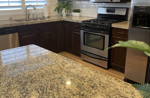 The kitchen has everything including a coffee maker, blender, a small crock pot, popcorn popper, hand mixer, a griddle, microwave, and ice/water dispenser. The dining table seats 6 and it can expand to seat 10 plus 3 more at the bar.