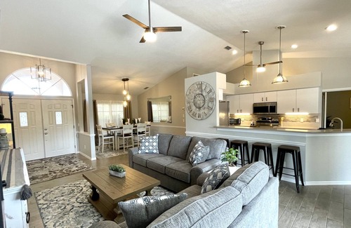 Well appointed, offers open concept living space and beautiful décor! The spacious living room has plenty of comfortable seating and a large flat screen smart TV to watch the big games or enjoy your movie nights. The well-equipped modern kitchen offers granite countertops, stainless steel appliances, dishwasher, and microwave, lots of cabinets, separate pantry, and a breakfast bar with bar stools. Do you need to wake up to a fresh cup of coffee to start your vacation day? Not a problem! This home offers a coffee bar equipped with both a Keurig and a standard coffee maker for you to make your perfect blend; along with an electric kettle, if you prefer a nice cup of tea! You’ll have plenty of choices on where to dine in this home, the formal dining room is perfect for family meals, have a more casual lunch in the dining nook table for 4, or enjoy your morning breakfast with water views on additional patio table with chairs. .