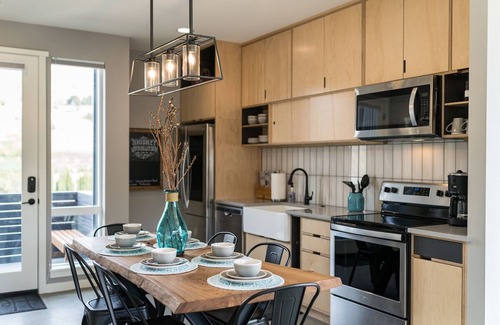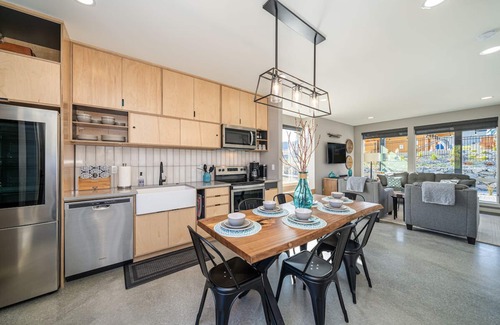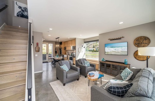 Whiskey Business is a modern cottage located in the new Vineyard district. The open floor plan, comfortable furnishings and convenient location is directly in front of the new Vineyard district pool and hot tub that creates a perfect place to stay for family and friends. The pool is covered in the winter months which makes it perfect for enjoying a swim when the snow is on the ground. The house features two full bedrooms upstairs with vaulted ceilings and large windows and a pullout sleeper sofa downstairs with a full bath. Whiskey Business is kid and pet-friendly with concrete floors on the first floor and carpeting upstairs.