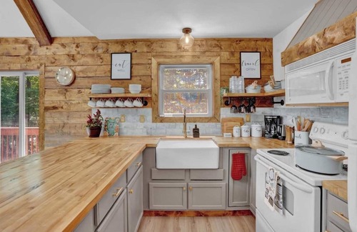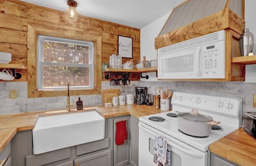 - Appliances: Farm Sink, Refrigerator, Microwave, and Electric Oven With 4-Burner Stovetop
