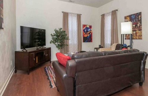 This property is a 3 bedroom, 1 bathroom unit that is located on the 2nd floor of a duplex. The large bedroom is the largest room in the house and has a queen-size bed, chest of drawers, night tables, sitting area and 43 smart TV. The medium bedroom has a full-size bed, night table, chair, chest of drawers, and 43 smart TV. The third bedroom is furnished as an office, but can be converted into a twin-sized bedroom upon request. The living room has plenty of seating and a 55 smart TV. The kitchen is fully stocked with basic appliances, pots, pans, dishes, cutlery and other basic kitchen items. All bedding and towels are provided.
