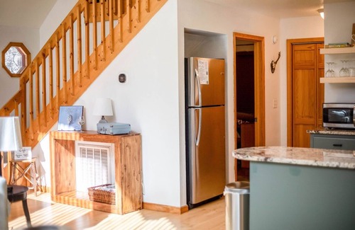 The main floor bedroom is roomy and features a Queen-size bed also with organic cotton sheets and comforter and is designed to contribute to a comfortable stay. You'll also have your own flat-screen TV in this bedroom, a dresser for storage, and a walk-in closet for anything that needs to be hung. Just across the hall is a full bathroom with a bathtub.