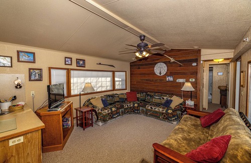 Large living room with double futon (CHARGES APPLY IF THIS FUTON IS USED $10), propane fireplace.
