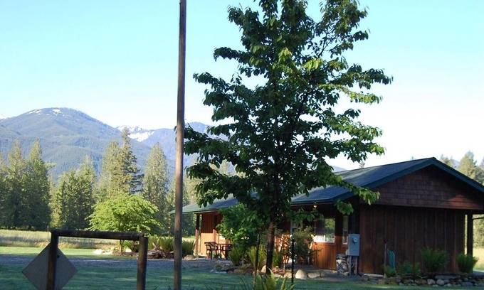 Nestled in the center of our 580 acre cattle ranch, our log cabins and guesthouses are surrounded by the foothills of the North Cascades, the Skagit River and offer our guests stunning views of the mountains and a tranquil atmosphere for relaxing. Make this your basecamp for extended outdoor activities for the whole family or a relaxing night away from it all. We do not serve breakfast at this time. Our log cabins and guesthouses are fully equipped with linens, soap, shampoo, hair dryer, gas fireplace, kitchen utensils, drinkware and cookware, extra bedding for the futon, TV with DIRECTV, internet, AC, kitchenettes, some with full kitchens and barbeques. We offer 3 pet friendly units. Enjoy farm animals and barnyard critters, abundant wildlife, walking trails and the Skagit River. At the end of your day return to your cabin for a memorable evening at the central firepit or snuggle up indoors at your cozy fireplace.1 bedroom 1 queen bed, 1 full bed (CHARGES APPLY IF THE FULL BED IS USED $10), full bath with shower/ tub.