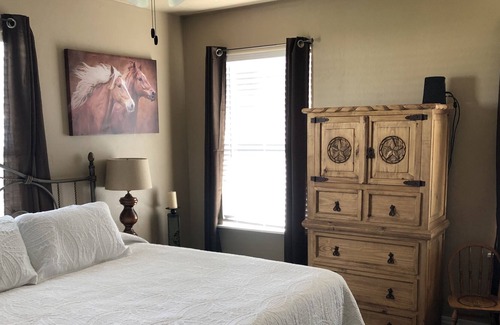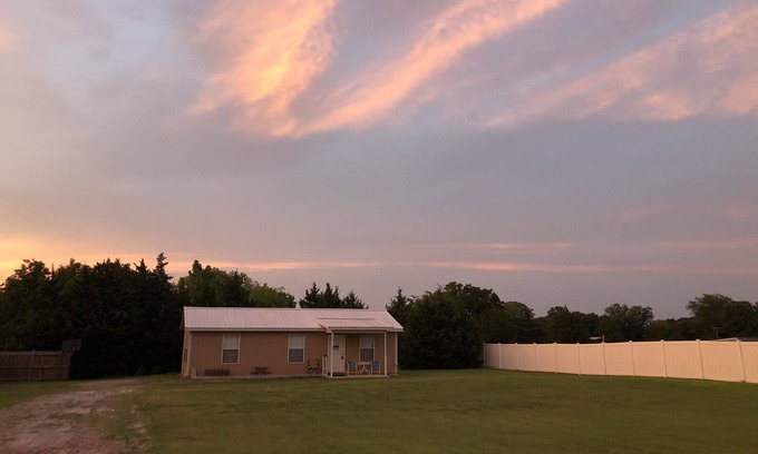 Rustic Retreat is a guest house located on our 10 acre ranch. We decided to make it a vacation home in hopes that it will bless as many families/couples/individuals as possible. It is only 3 years old and has modern and rustic furnishings. You will find it to be private and peaceful and to have a "warm and inviting country" feel. Enjoy watching the birds while sipping your coffee and reading a book on the covered front porch. Or sit out under the starts on the large backyard deck while grilling and basking by the firepit. We are only five minutes form the small, quaint town of Meeker. There you will find a few restaurants, like The Shed (seen on Discover Oklahoma) with fresh ingredients and gorgeous décor. Located next door is The Meeker Trading Company, a beautiful collection of antiques and new items to shop for and purchase. The two businesses are owned by the same friendly couple. Across the street, you will find Ma and Pa's Creamery where they serve some yummy, homemade ice cream and treats. If you feel like exploring a little further, you can do so in any direction you wish. Either way you turn, you will find small, quaint towns with their own character and specials. If you are looking for more, head south to the city of Shawnee, where they have most everything you could you possibly need. There are often fun events and festivities held at the Heart of Oklahoma Exposition Center in Shawnee, in which we are only 17 miles away from. Shawnee boasts several restaurants and shopping experiences, as well as museums, and a community pool with a few water slides. With highways and turnpikes, as well as the famous Route 66 only 12-15 minutes away, you can go wherever your heart desires. If you want to take more of a day trip or half a day trip, head an hour west to Oklahoma City. Downtown OKC has so many restaurants to offer, several museums and lot of activities to do. If you are interested in water activities, OKC has a water park, called White Water Bay or if you are looking for some inside activities like arcades and move theaters, they have several. OKC has a wonderful zoo with lots of exotic animals and shows. If you feel up to it, you can brave the theme park, Frontier City, where you can ride lots of roller coasters and see their fabulous shows. (Check the locations for times and dates open). There is so much to do in OKC, you will not be bored.