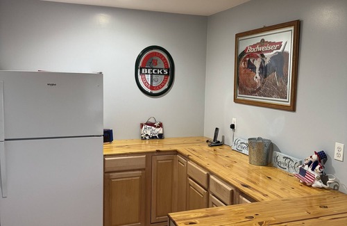 The lower level also has a large family room with a fireplace and walks out to large patio with patio table, picnic table, lounge chairs, fire pit and hammock. The open concept of the lower level allows you and your guests to not only enjoy the TV and fireplace but also play a round of pool or game of ping pong. There is a dry bar with a separate fridge. Additionally, there is a laundry/ storage room with a full size washer and dryer.